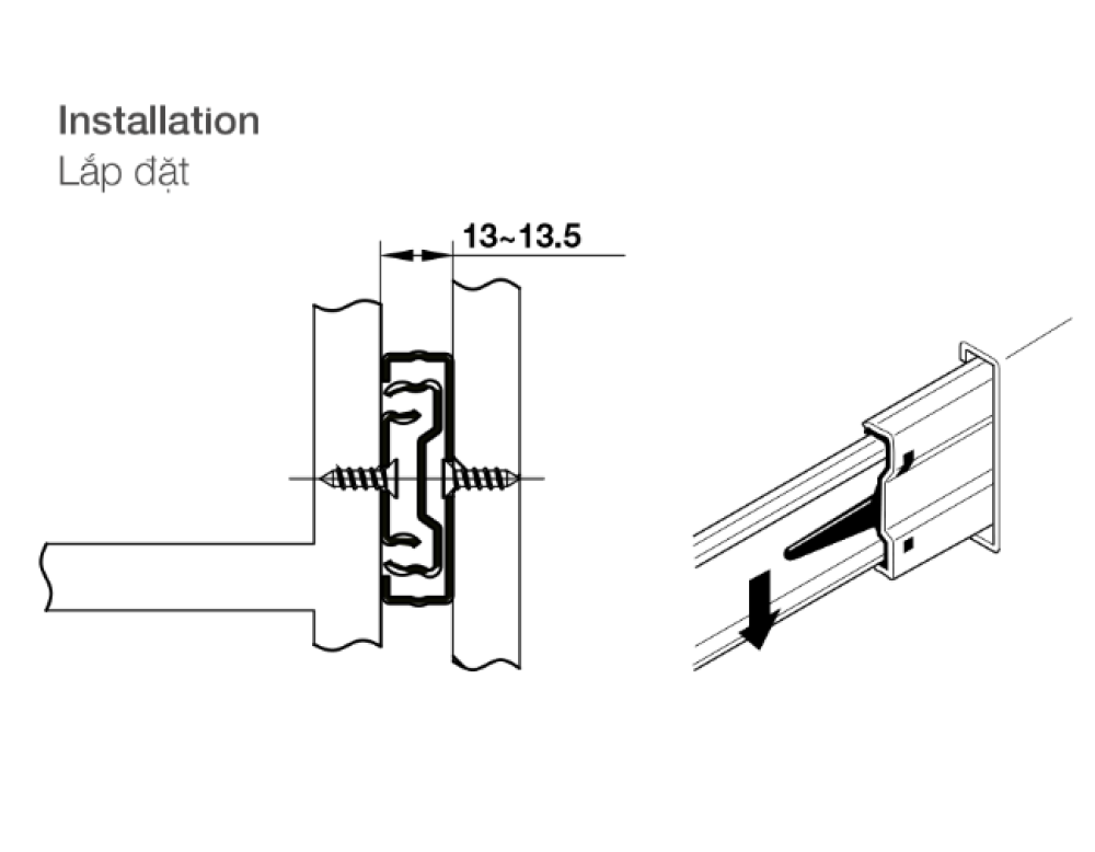 - Lắp đặt vào ray hộp : bắt vít, lắp đặt ở mặt bên